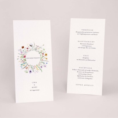 Ein Tipp von unseren Mitarbeitern: Wenn Sie sich für eine Menükarte entschieden haben, sehen Sie auf der Produktseite unter dem Artikelbild weitere Produkte im gleichen Design. Lassen Sie sich davon inspirieren und machen Sie aus Ihrer Hochzeit ein unvergessliches Ereignis mit wunderschön stimmigen Erinnerungsfotos.