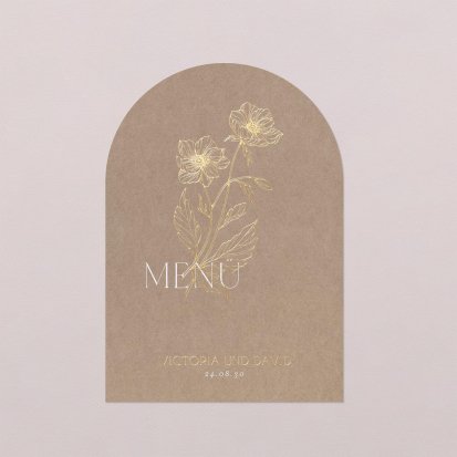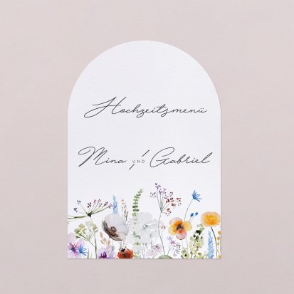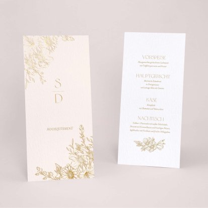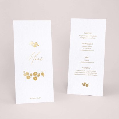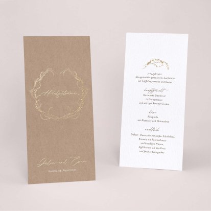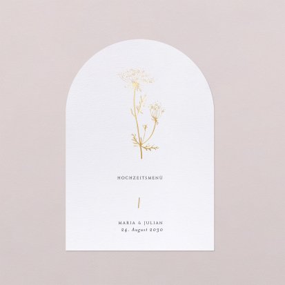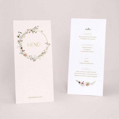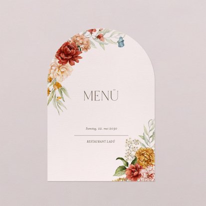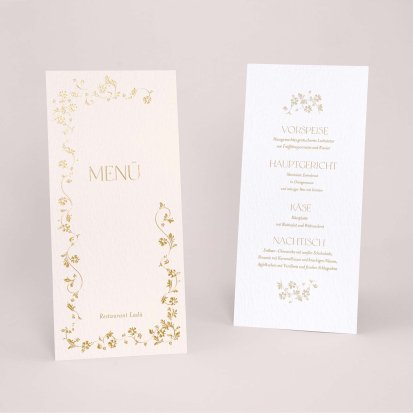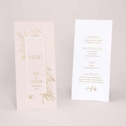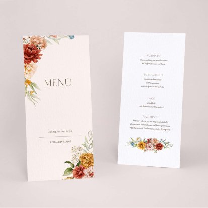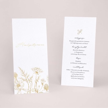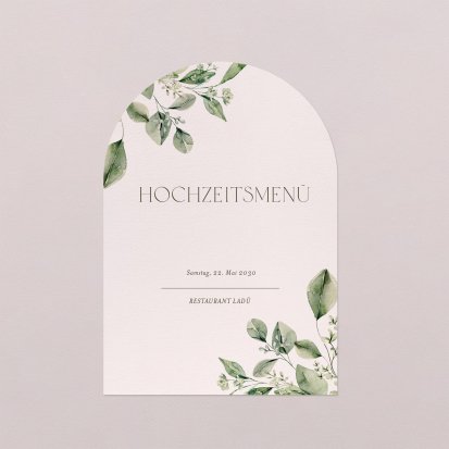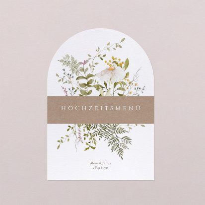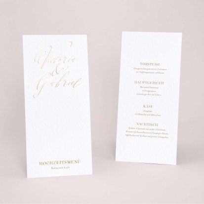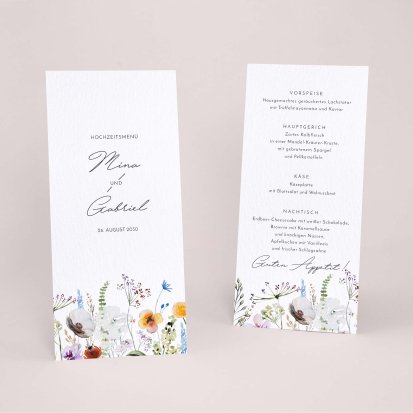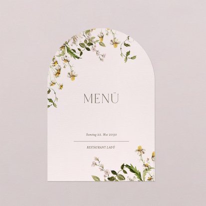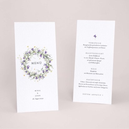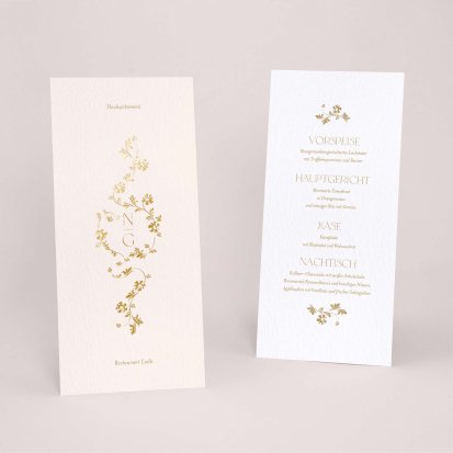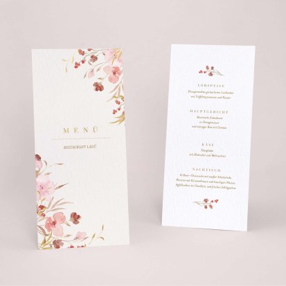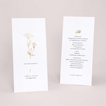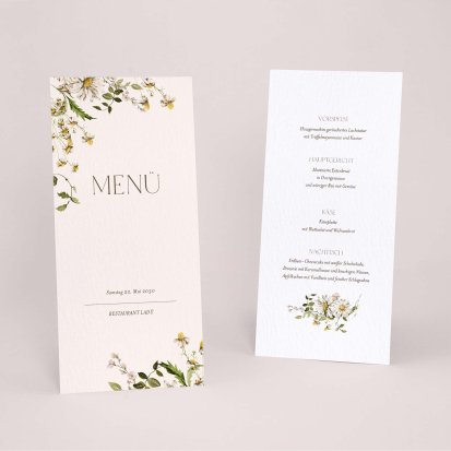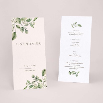 Ergänzen Sie die Deko auf den Hochzeitstischen auf bezaubernde Weise mit sorgfältig gestalteten Menükarten und sorgen Sie für Vorfreude auf das Hochzeitsmenü!