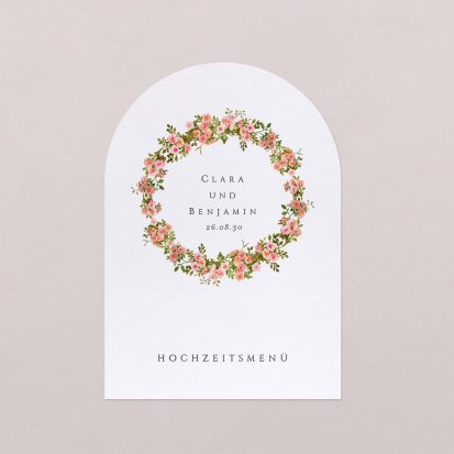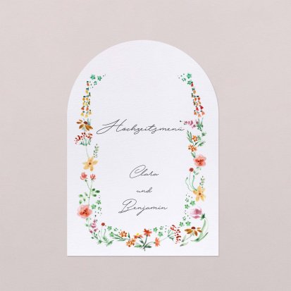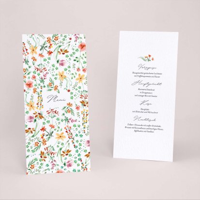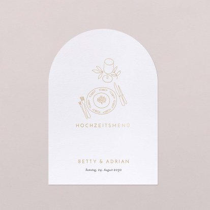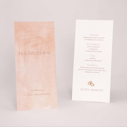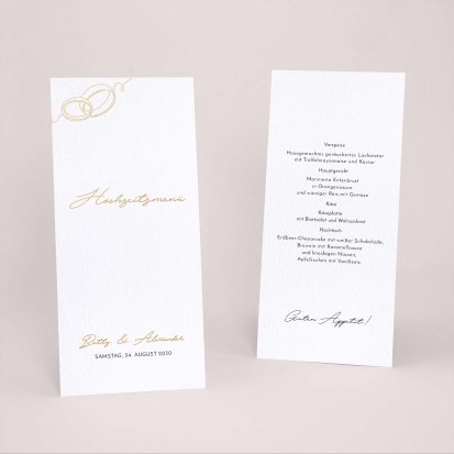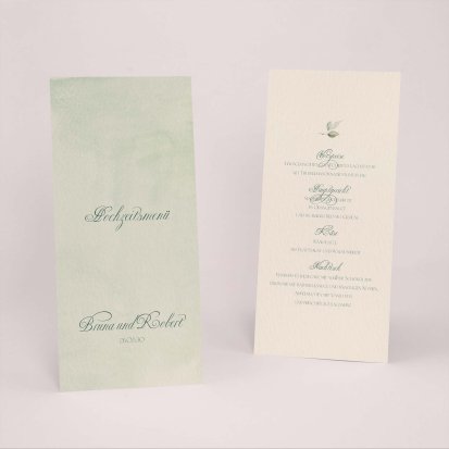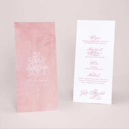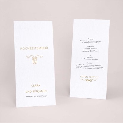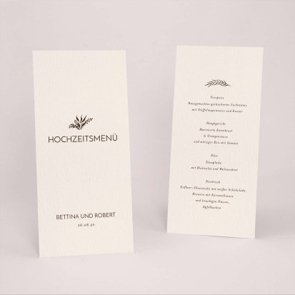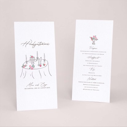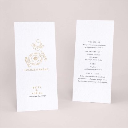 Ergänzen Sie die Deko auf den Hochzeitstischen auf bezaubernde Weise mit sorgfältig gestalteten Menükarten und sorgen Sie für Vorfreude auf das Hochzeitsmenü!