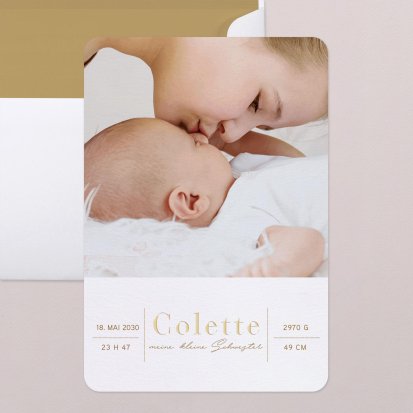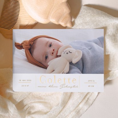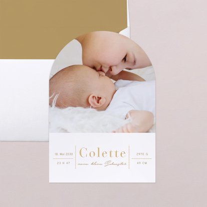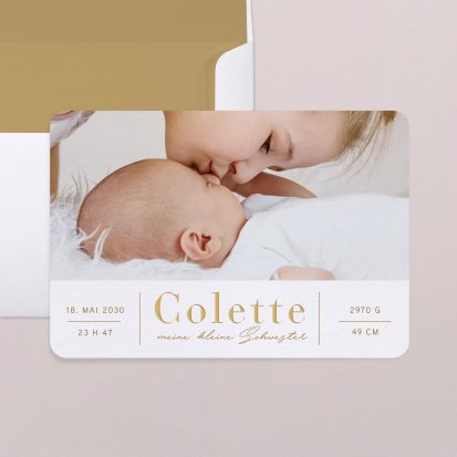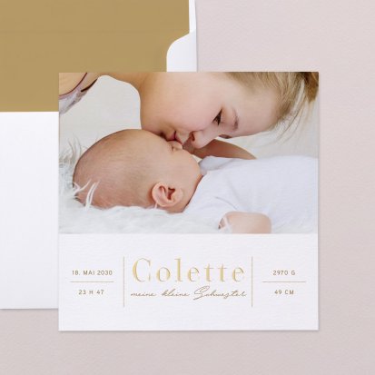 Damit in Sachen Papeterie alles zu Ihrer Ankündigung passt, bieten wir Ihnen bei Cotton Bird die unterschiedlichsten Designs als Basis für Ihre Geburtskarten – von Designs mit Fotos über bunte Illustrationen bis hin zu Vorlagen mit Gold-, Kupfer- oder Hochglanzveredelungen. Diese können Sie beispielsweise vorab schon mit der Filterfunktion eingrenzen, um schneller die Karte zu finden, die zu Ihren Vorstellungen passt. Neben der Stilrichtung können Sie zudem auch die gewünschte Größe für Ihre Karte gleich zu Beginn festlegen.