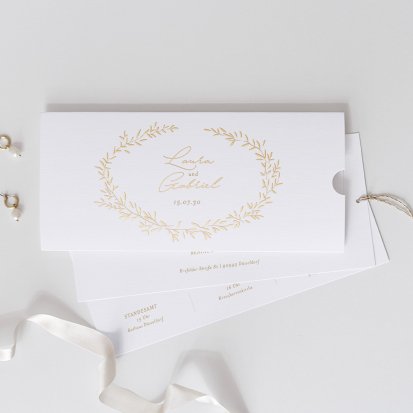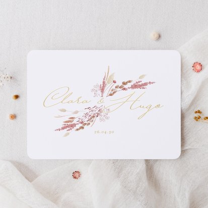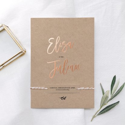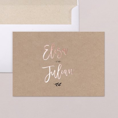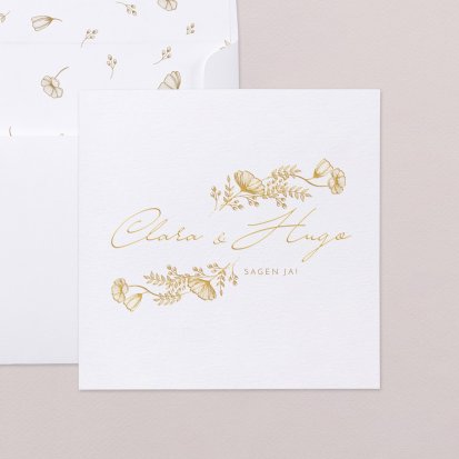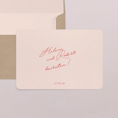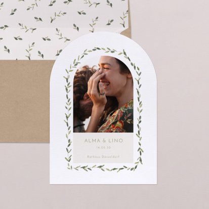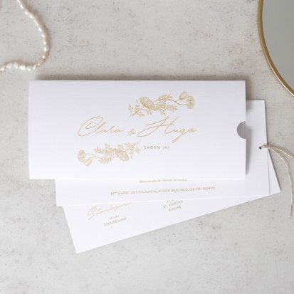 Zu einer Trauung im rustikalen Landhaus passen Hochzeitseinladungen auf Kraftpapier und Schiefer. Auch Hochzeitskarten mit floralem Muster eignen sich in einem solchen Fall sehr gut. Falls Sie lieber eine klassische Hochzeitsthematik oder ein minimalistisches Konzept im Scandi Chic bevorzugen, finden Sie auch hierfür eine große Auswahl an schlichten, aber eleganten Karten. Wenn Ihre Einladungen zur Hochzeit ein bisschen verspielter sein dürfen, bieten sich blumige Karten auf sanftem Offwhite an. Kupferfarbene Highlights machen die zarten Designs zusätzlich zu einem eleganten Blickfang. Wenn Sie Ihre Feier dagegen lieber an die Märchen aus 1001 Nacht anlehnen möchten, bringen Sie Ihre Gäste mit Einladungskarten mit aufwendigen Arabesken und zarten Ornamenten in die richtige Stimmung. Hier bieten sich auch kleine Goldveredelungen wunderbar an. Unsere Hochzeitseinladungen sind auch auf Französisch erhältlich.