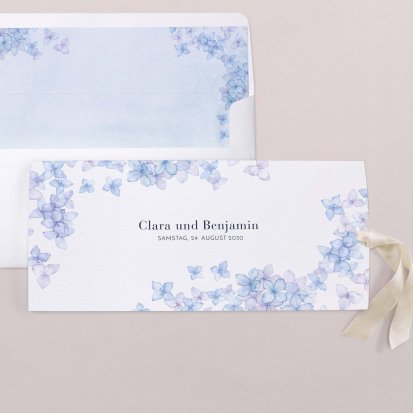 Aufkleber, Kordeln, Bänder, Stoffeinsätze, Anhänger, Transparentpapier, Gold-Applikationen und Trockenblumen setzen romantisch-verspielte oder edel anmutende Akzente. Für ein einheitliches Gesamtbild kann der Umschlag das Kartendesign in Stil und Farbe aufgreifen.