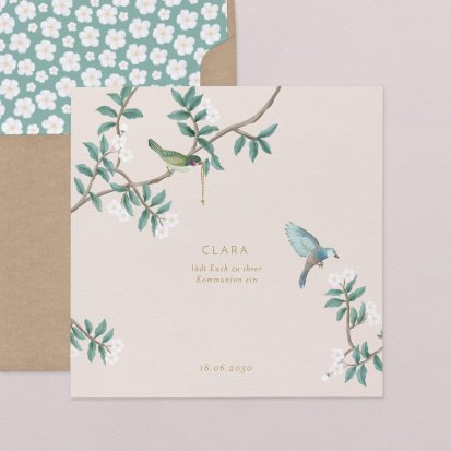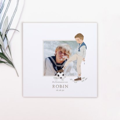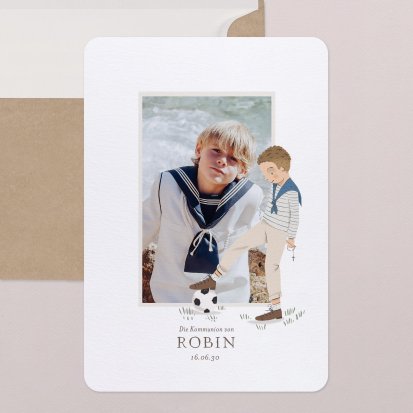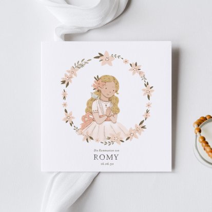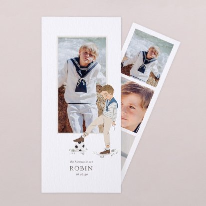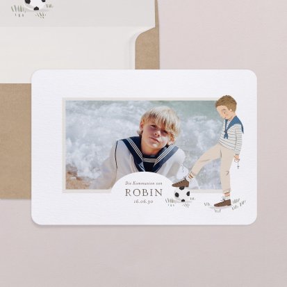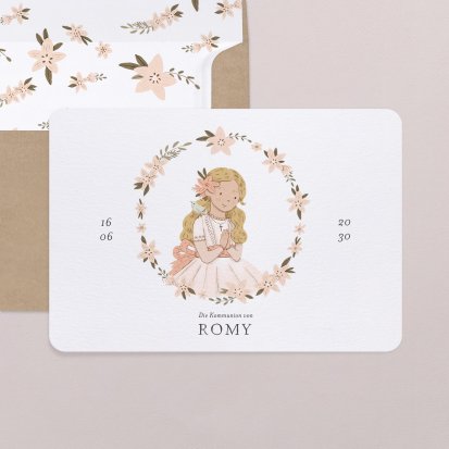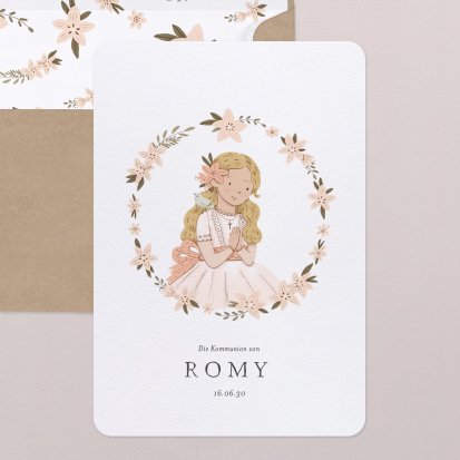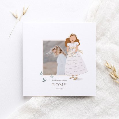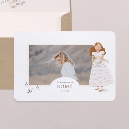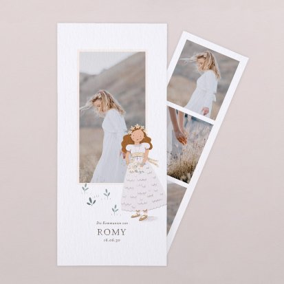 Wer es originell mag, entscheidet sich gerne für die Karte "Liberty Pfirsich". Inspiriert von den englischen Liberty-Stoffen, schmücken bunte Blumen die Einladungskarte. Auf der Frontseite der Klappkarte lächelt das Kommunionkind, eingebettet in der Blütenpracht, seine Gäste an. Auf der Innenseite ist links Platz für ein weiteres Foto. Rechts sind die Informationen zur Feierlichkeit notiert.