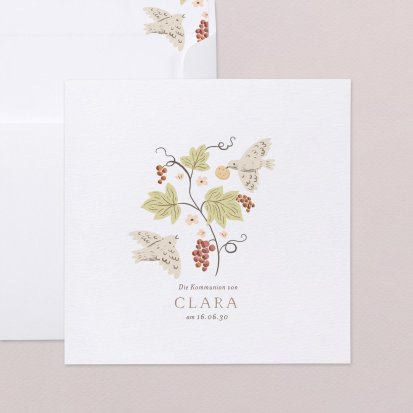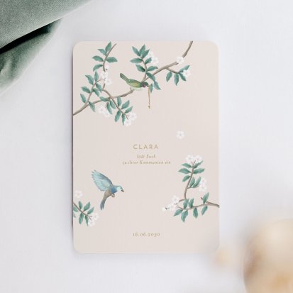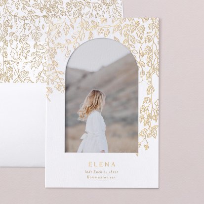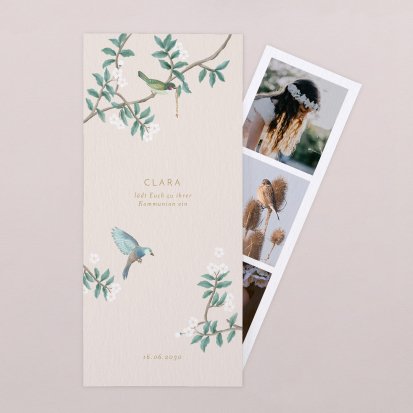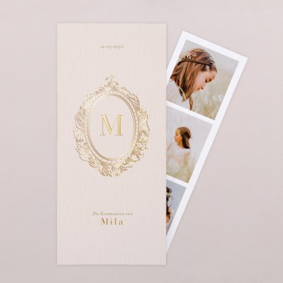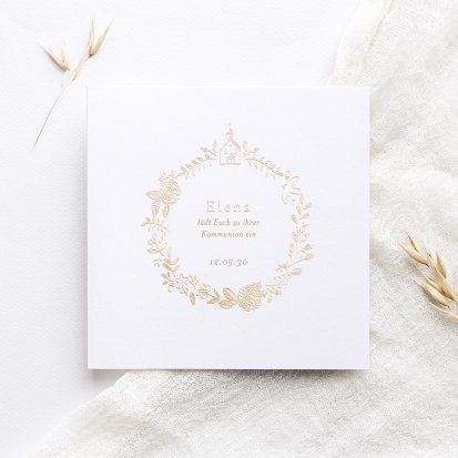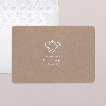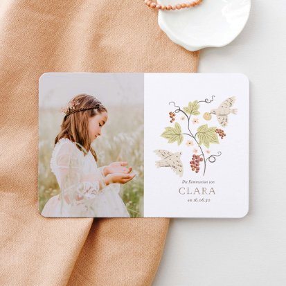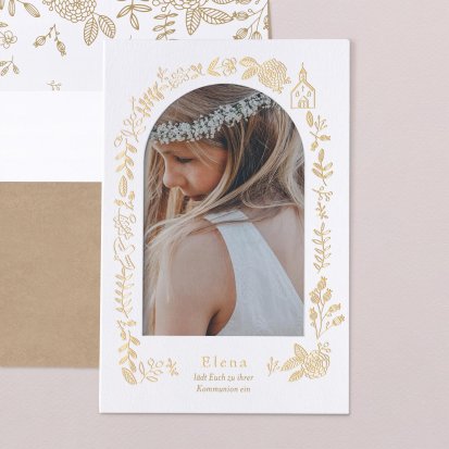 Sie möchten klassische Einladungskarten zur Kommunion verschicken? Dann sehen Sie sich gerne das Design "Goldvogel" an. Auf der Vorderseite trägt eine filigrane Taube mit goldenen Veredelungen einen Zweig im Schnabel. Die Taube symbolisiert den Frieden und den Heiligen Geist. Unterhalb des goldenen Vogels steht, an welchem Tag die Feier stattfinden wird. Auf der Rückseite ist Platz für ein Foto des Kommunionkindes und weitere Informationen.