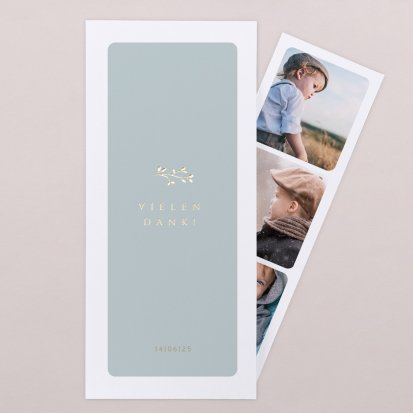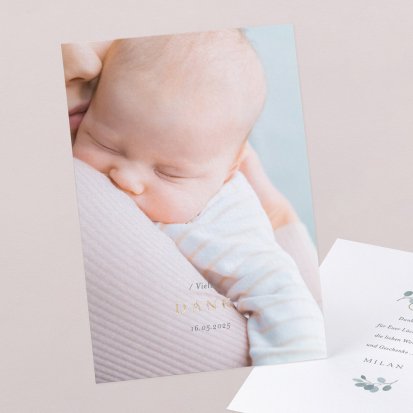 Klassisch, rustikal oder verspielt – wir bieten ganz unterschiedliche Motive. Oder Sie bevorzugen bei der Danksagung zur Taufe eine Karte, die vorne mit einem Bild Ihres Kindes gestaltet ist? Dann sind die Motive "Fidèle" oder "Chou" die passende Wahl für Sie. Zudem bieten wir Ihnen Danksagungskarten mit Veredelungen an. So sorgt beispielsweise das Motiv "Little Steps Gold" mit zwei kleinen, goldenen Fußabdrücken für den richtigen Glanz. Neben Goldveredelungen finden Sie bei Cotton Bird auch Kupferveredelungen. Außerdem können Sie sich für Ihre Danksagung zur Taufe auf Karten in Hochglanz setzen. Um das passende Design für Ihre Liebsten zu finden, durchstöbern Sie unser Sortiment oder Sie nutzen unseren praktischen Filter. Hier können Sie die angezeigten Produkte nach folgenden Merkmalen filtern: