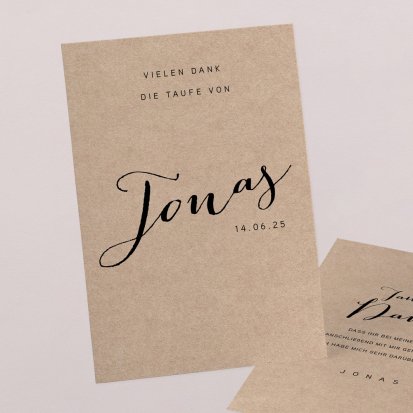 Wir empfehlen, die passenden Danksagungskarten bereits vor der Taufe zu ordern und fertig für den Versand zu machen. So können Sie die Karten direkt nach der Feier verschicken. Ansonsten empfehlen wir Ihnen, die Danksagung zeitnah nach der Taufe zu bestellen. Wir benötigen in etwa vier bis fünf Arbeitstage für die Produktion. Zudem kommt die Lieferzeit von drei bis fünf Werktagen hinzu. Somit kommen die Karten in der Regel nach sieben bis zehn Tagen bei Ihnen an.