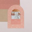 Die Geburtsanzeige In den Wolken zeigt eine Schar kleiner Vögel vor einem Himmel in zarten Pfirsichrosa-Tönen. Ein sanftes und friedliches Design, das perfekt ist, um Ihr Glück auf sanfte Weise anzukündigen.