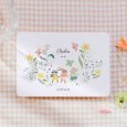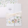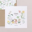 Auf der Geburtskarte Lucky day tummeln sich Maus, Hase und Waschbär in einem Feld bunter Blumen. Ein fröhliches Frühlingsmotiv voller Sanftheit, das die Ankunft Ihres größten Glücks perfekt ankündigt.