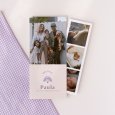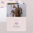 Diese Geburtskarte mit dem Namen Pizy zeichnet sich durch ihre elegante Schlichtheit aus. Das Babyfoto und die wichtigsten Details der Geburt werden hervorgehoben, der Vorname wird in einem hübschen mauvefarbenen Schriftzug enthüllt. Das Kultmotiv von Gamin Gamine, ein kleines Hündchen, ist auf diesem Design zu sehen und überbringt die Geburtsankündigung auf liebevolle Weise.