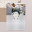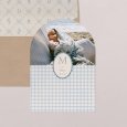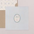 Mit seinem charakteristischen Vichy-Muster erzählt die Geburtskarte Vichy – blau zart und liebevoll von der Ankunft Ihres Neugeborenen, in einer Komposition aus sanften Blautönen. – Farbe: blau, beige – Thema: originell, farbenfroh – Illustrationen: Vichy-Muster