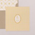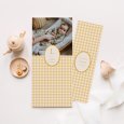 Inspiriert vom zeitlosen Vichy-Stoff kündigt die Geburtskarte Vichy – Senfgelb die Geburt Ihres Kindes in warmen Senftönen an. – Farbe: gelb, senfgelb, beige – Thema: originell, farbenfroh – Illustrationen: Vichy-Muster
