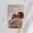 Auf der Geburtskarte Goldkind erstrahlt Ihr süßestes Babyfoto auf der gesamten Vorderseite. Der Vorname Ihrer Tochter oder Ihres Sohnes sowie das Datum der Geburt sind in edlem Gold auf das Foto aufgedruckt. Das schlichte Design lenkt alle Aufmerksamkeit auf die Ankündigung der Geburt Ihres Kindes. Sie können diese trendige Geburtsanzeige im wenigen Schritten selbst online mit dem Editor gestalten.