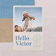 Hallo Baby! Auf der Geburtskarte Colorama - Azur lenkt die verspielte Schrift in coolem Blauton alle Aufmerksamkeit auf den Namen Ihres kleinen Jungen. Zusammen mit Ihrem schönsten Babyfoto, dem Geburtsdatum im Stempeldesign und dem originellen Kartenformat ist diese Geburtsanzeige ideal, um Ihren Liebsten auf trendige Weise von Ihrem Familienzuwachs zu berichten.
