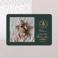 Teilen Sie Ihr Babyglück mit der Geburtskarte Green and gold. Winterliches Grün, elegante Schrift und ein kleiner Weihnachtsbaum in Gold machen dieses Design perfekt, um Ihr Wintermärchen zu erzählen.