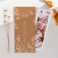 Die Geburtsanzeige ist eine Karte im Hochformat, die aus einem Mittelteil und zwei beweglichen Seitenteilen besteht. Wenn Sie die beiden Seiten öffnen, werden die wichtigsten Details zur Geburt Ihres Kindes enthüllt. Sie können mit einem hübschen Band (nach Wahl und gegen Aufpreis) geschlossen gehalten werden.