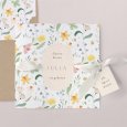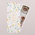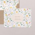 Narzissen, Veilchen, Löwenzahn und andere bunte Blumen schmücken die Geburtskarte Lilly Rose. Frisch und frühlingshaft wird dieses bezaubernde Motiv mit niedlichen Bienen die Ankunft Ihres kleinen Mädchens oder Jungen perfekt verkünden.