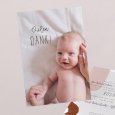 Diese Danksagung hat es in sich: die Klappkarte im Hochformat beinhaltet einen Fotostreifen mit Platz für 3 Ihrer schönsten Babyfotos.