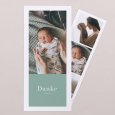 Diese Danksagung hat es in sich: die Klappkarte im Hochformat beinhaltet einen Fotostreifen mit Platz für 3 Ihrer schönsten Babyfotos.