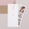 Diese Danksagung hat es in sich: die Klappkarte im Hochformat mit wunderschönen Trockenblumen beinhaltet einen Fotostreifen mit Platz für 3 Ihrer schönsten Babyfotos. Der Streifen kann als Andenken in der Karte aufbewahrt werden, aber auch herausgenommen und an den Kühlschrank gepinnt oder als Lesezeichen genutzt werden.