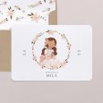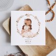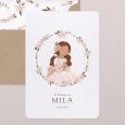 Auf der Einladungskarte Glaube II bereitet sich ein Mädchen mit braunem Haar auf ihre bevorstehende Kommunion vor. Sie trägt ihr schönstes Kleid und ist von einem zarten Blütenkranz eingerahmt. Laden Sie Familie und Freunde mit dieser liebevoll illustrierten Karte zur Heiligen Erstkommunion Ihrer Tochter ein.