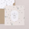 Zarte blaue Vergissmeinnicht-Blüten zieren die Einladungskarte Myosotis. Poetisch und sanft mit feinen Streifen verbreitet dieses liebevolle Design eine zarte Atmosphäre und ist ideal, um die Kommunion Ihres Kindes im Frühling oder Sommer anzukündigen.