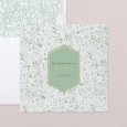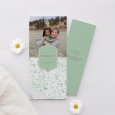 Die Einladungskarte Amanda zeigt ein frühlingshaftes Blumenarrangement in sanften Grüntönen, veredelt mit goldenen Akzenten. Diese poetische und einzigartige Kreation ist perfekt, um die Kommunion Ihres Kindes im Frühling oder Sommer stilvoll anzukündigen.