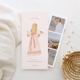 Diese Kommunionskarte steckt voller Zärtlichkeit: Sanfte Pastelltöne und ein Mädchen, das in die freudige Begegnung mit einem kleinen Vogel vertieft ist. Die poetische Illustration ist mit Goldfolie veredelt und wird Familie und Freunde als Einladung zur Kommunion Ihrer Tochter begeistern.
