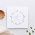 Die Kommunionkarte Violetta ist mit einem zarten Blumenkranz aus feinen Violetten Blüten illustriert. Das poetische Design der Einladungskarte wirkt elegant und passt perfekt zu einer liebevollen Kommunionsfeier im Frühling.