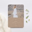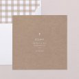 Der elegante Kraftpapierhintergrund der Einladungskarte Glückwunsch ist mit einem schlichten weißen Kreuz verziert, das die bevorstehende Kommunionsfeier symbolisiert. Die Karte kann mit einem schönen Foto von Ihrem Kind gestaltet werden, so dass die Einladung noch persönlicher wird.