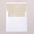Auf der Hochzeitseinladung Bow and Rings sind zwei goldene Ringe durch ein stilvolles Band miteinander verbunden. Die Namen des Brautpaares, kunstvoll in Gold veredelt, verkünden emotional und elegant Ihre bevorstehende Trauung.