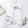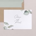 Zart illustrierte Eukalyptuszweige auf weißem Papier machen die Hochzeitseinladung Piana zu einem wunderschönen Blickfang. Das Design ist schlicht und elegant zugleich und weckt Vorfreude auf ein unvergessliches Hochzeitsfest.