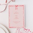 Ein zartes Band in Aquarellfarben veredelt Ihre frohe Botschaft auf der Hochzeitseinladung Satine. Die elegante Typografie und die rosafarbenen Töne verleihen diesem leichten Design eine romantische Note, die sich ideal für eine stilvolle und romantische Zeremonie eignet.