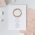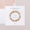 Ein poetischer Kranz aus rosafarbenen Blumen schmückt die Hochzeitseinladung Cottage. Diese zarte, farbenfrohe und frische Kreation ist ideal, um einen besonderen Tag mit einem ländlich-romantischen oder bohème-inspirierten Thema anzukündigen.