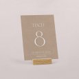 Passend zur Einladungskarte wird diese Tischnummer Ihre Dekoration am großen Tag perfekt ergänzen. Präsentieren Sie sie auf einem eleganten Kartenhalter aus Holz (optional erhältlich), binden Sie sie mit einer Schnur um eine mit Trockenblumen gefüllte Glasvase... lassen Sie Ihrer Fantasie freien Lauf!