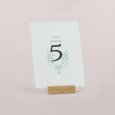 Passend zur Einladungskarte wird diese Tischnummer Ihre Dekoration am großen Tag perfekt ergänzen. Präsentieren Sie sie auf einem eleganten Kartenhalter aus Holz (optional erhältlich), binden Sie sie mit einer Schnur um eine mit Trockenblumen gefüllte Glasvase... lassen Sie Ihrer Fantasie freien Lauf!