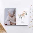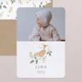 Ein niedlicher kleiner Vogel verkündet mit fröhlichem Zwitschern die frohe Botschaft: die Taufe Ihres Kindes steht bevor! Auf dieser hübschen Einladungskarte bekommt Ihr Lieblingsfoto einen Ehrenplatz direkt neben dem süßen Motiv auf der Kartenvorderseite.