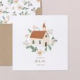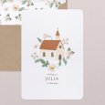 Hübsche weiße Blumen schmücken die kleine Kapelle, in der Ihr Baby den Taufsegen erhalten wird. Die Taufkarte Kleine Kirche ist eine süße Einladung für Familie und Freunde, die Taufe Ihre Kindes gemeinsam zu feiern.