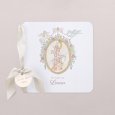Eine fantasievolle Welt in Pastelltönen zeichnet sich auf der Taufkarte Verzaubertes Medaillon ab. Ein geflügeltes Einhorn, eine Giraffe, ein Elefant, ein Fuchs und weitere niedliche Boten versammeln sich in dieser leicht nostalgischen Kreation, um Ihr Kind mit großer Zärtlichkeit auf seinem Weg im Glauben zu begleiten.